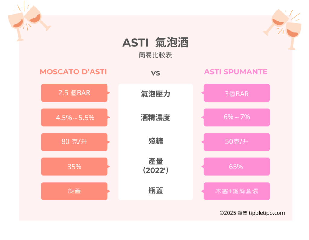 兩者的釀造方式大部分是一樣的,只是Moscato d’Asti的殘糖比較多,因此酒精濃度和氣泡感也都比較低一點點。
